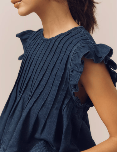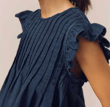 Ruffle-Sleeve Pleated Denim Swing Top – A playful twist on a classic you’ll reach for on cool evenings.
